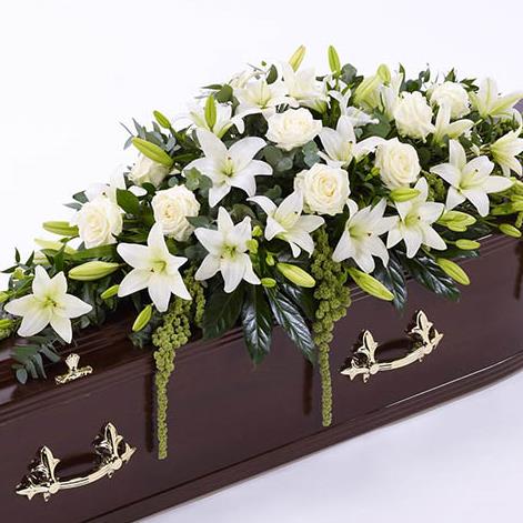 Beautiful Asiatic Lily and large-headed Rose in pure white are used to create this elegant casket spray. The fresh flowers are enhanced with trails of green amaranthus as well as ruscus, aralia leaves and eucalyptus. Approximate height 122cm (4ft).