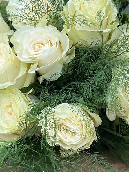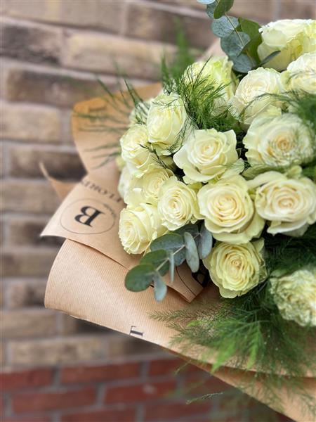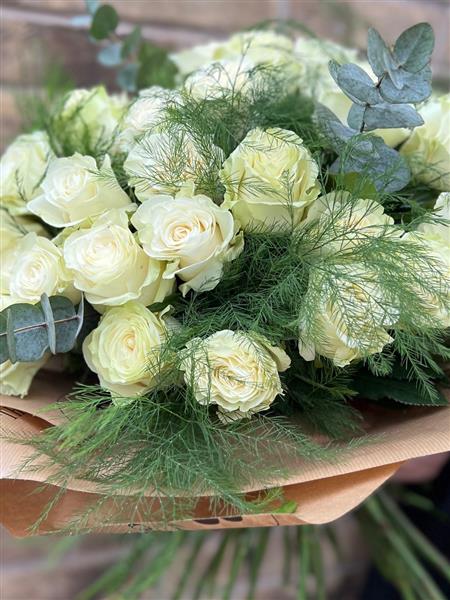 A stunning handtied array of 50 Luxury long stem Roses, with the stems kept long out of water. Finished with Eucalyptus and Fern.