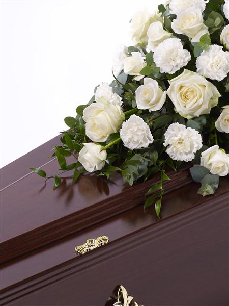 Large-headed white Rose combine with white carnations and luxurious foliages to create this traditional casket spray. Approximate height 153cm (5ft).