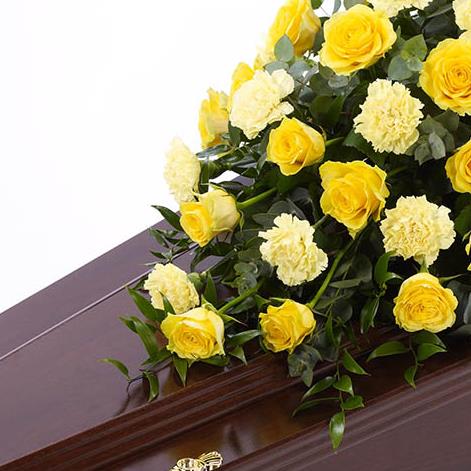 Large-headed white Rose combine with white carnations and luxurious foliages to create this traditional casket spray. Approximate height 92cm (3ft).