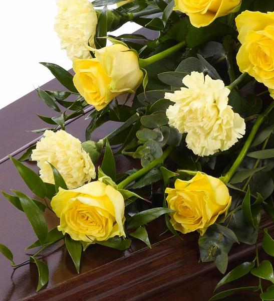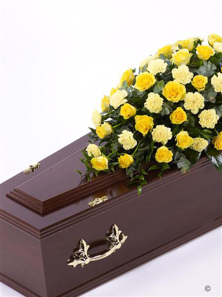 Large-headed yellow Rose combine with yellow carnations and luxurious foliages to create this traditional casket spray. Approximate height 122cm (4ft).
