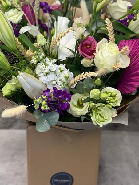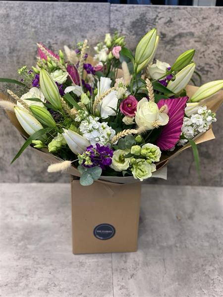 Our Bright and Beautiful Handtied is created using a mixture of beautiful dried and fresh ingredients arranged together in a water bubble and presented in a flower box - just stunning!