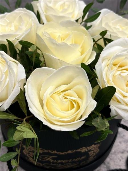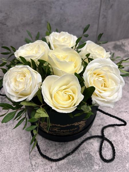 This beautifully simple hatbox has been arranged with large headed White Roses, and foliage. Made into a Luxury black hatbox.