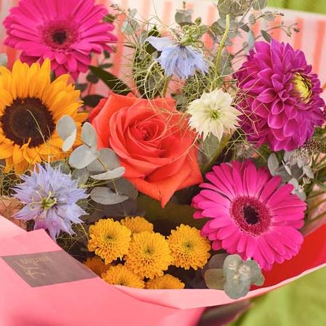 A brilliantly bright bouquet bursting with fresh blooms in rich, vivid shades. Expect shades of cerise, saffron and tangerine with pops of blue. You might also see painted or dried foliage, but you won't see a single lily.
